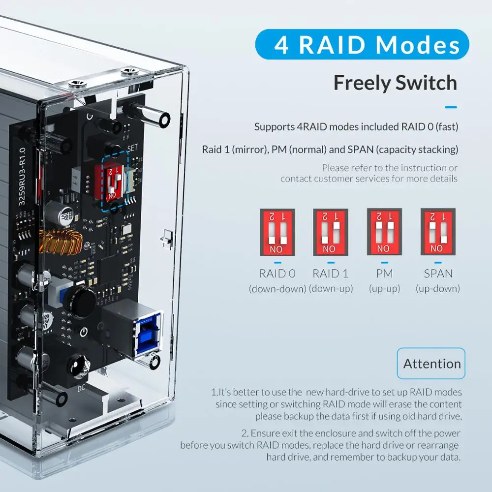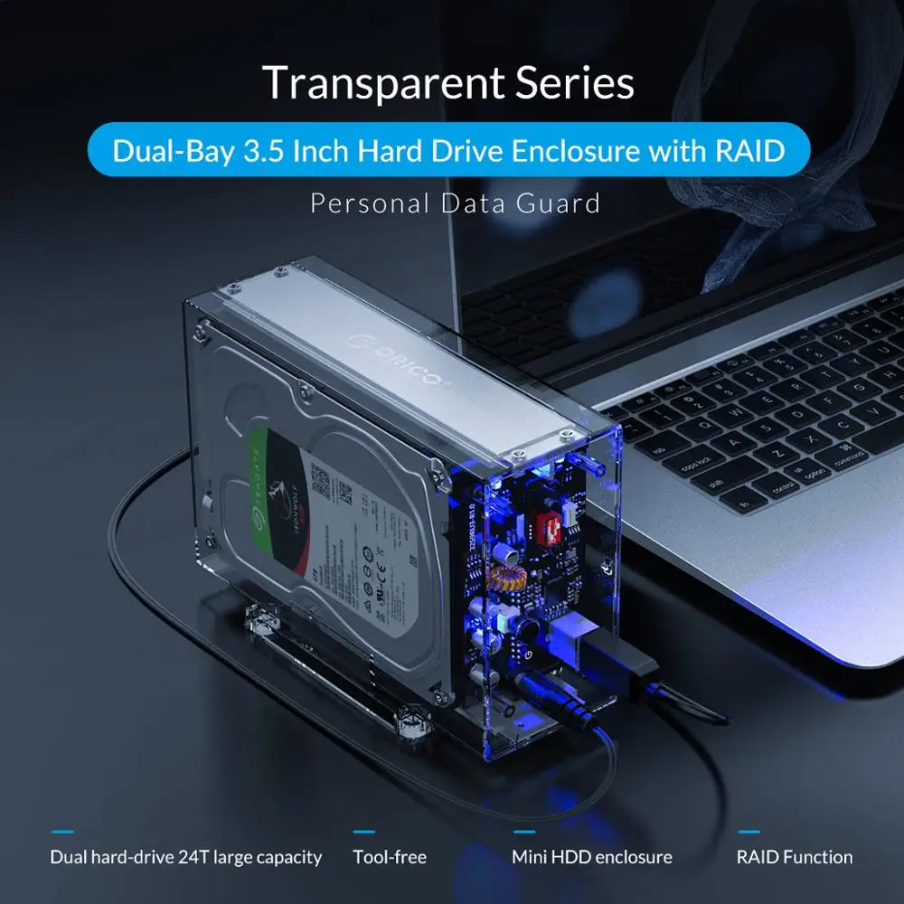 Product Name: ORICO 3.5\" 2 Bay HDD Enclosure With RAID 0 1 PM SPAN Transparent USB3.0 to SATA External Hard Drive Case Box Support 24TB UASP