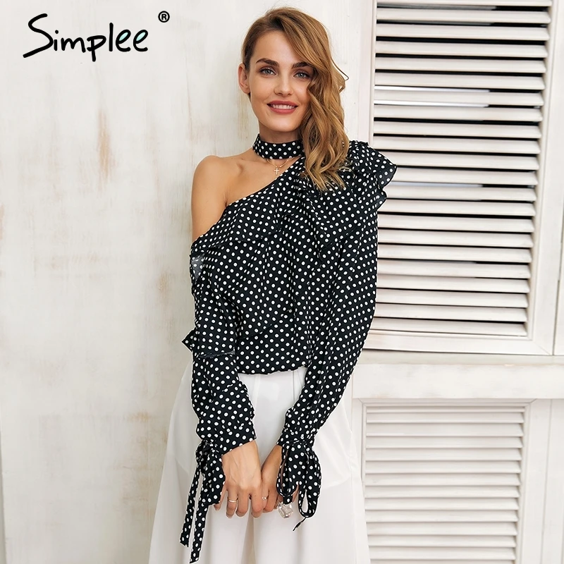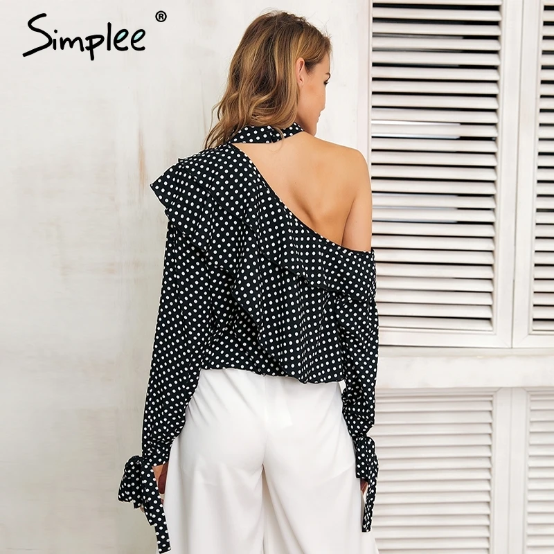 Special Offer Simplee One shoulder polka dot blouse shirt Ruffle lantern sleeve vintage chiffon blouse Sexy bow women summer blouses 2019 Discount 45% Today!
