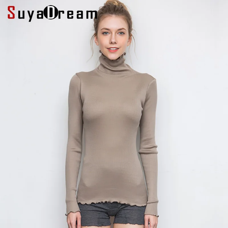 Product Name: SuyaDream Women Solid Turtleneck Pullovers 80%Silk 20%Cotton Slim Fit Rib Sweaters 2019 Autumn Winter Bottoming Knit wear