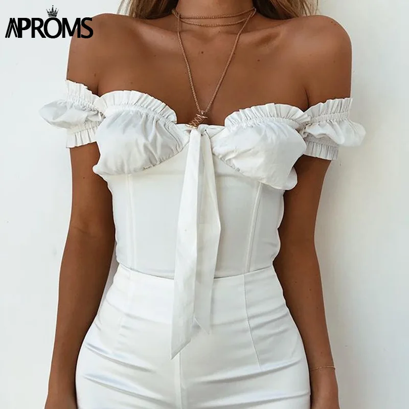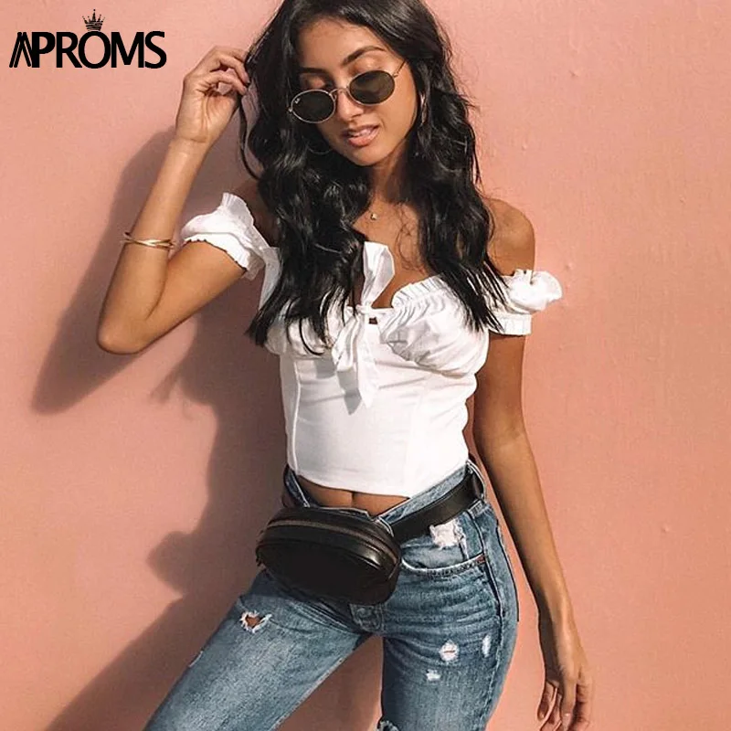 Product Name: Aproms White Off Shoulder Slim Blouse Women Casual Short Sleeve Bow Tie Summer Short Shirt Ladies Streetwear Crop Top 2019 Blusa