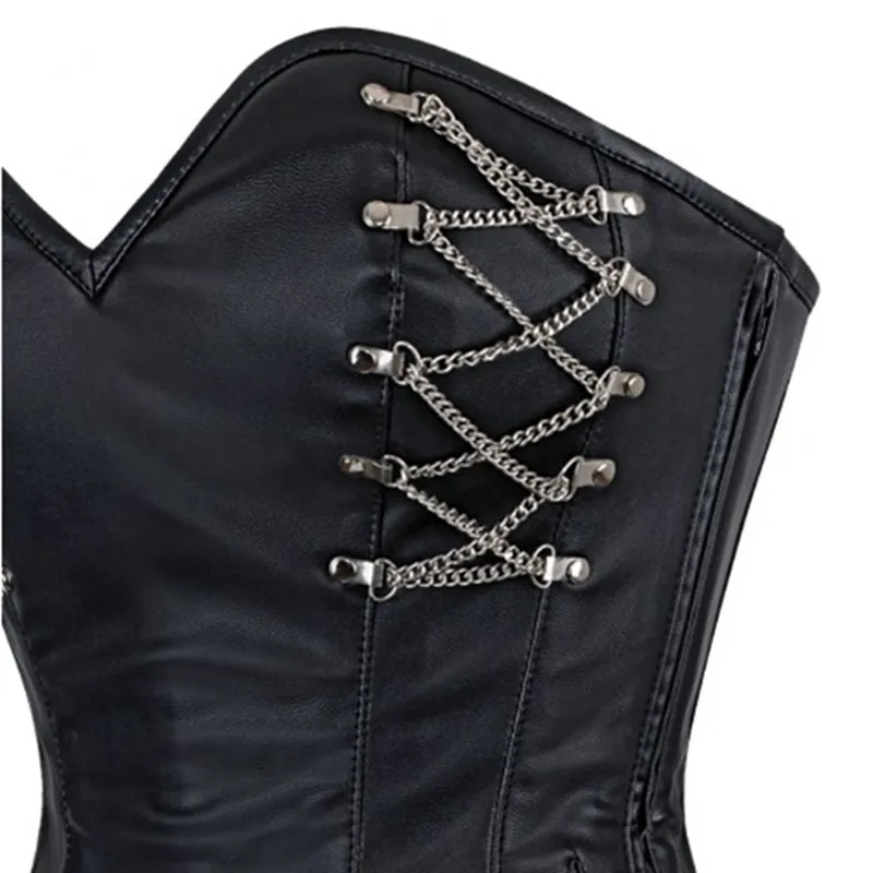 Product Name: Sliver Chain Style Sexy Women Leather Steampunk Corset Steel Boned Corset Gothic Faux Leather Black Shaperwear Corsage Korsett