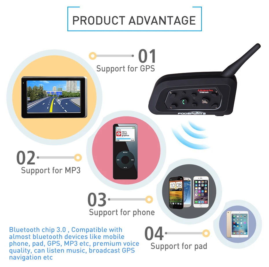 Product Name: Fodsports 2pc V6 Pro Intercom Motorcycle Bluetooth Helmet Headset Intercom 6 Rider 1200M Waterproof BT Interphone