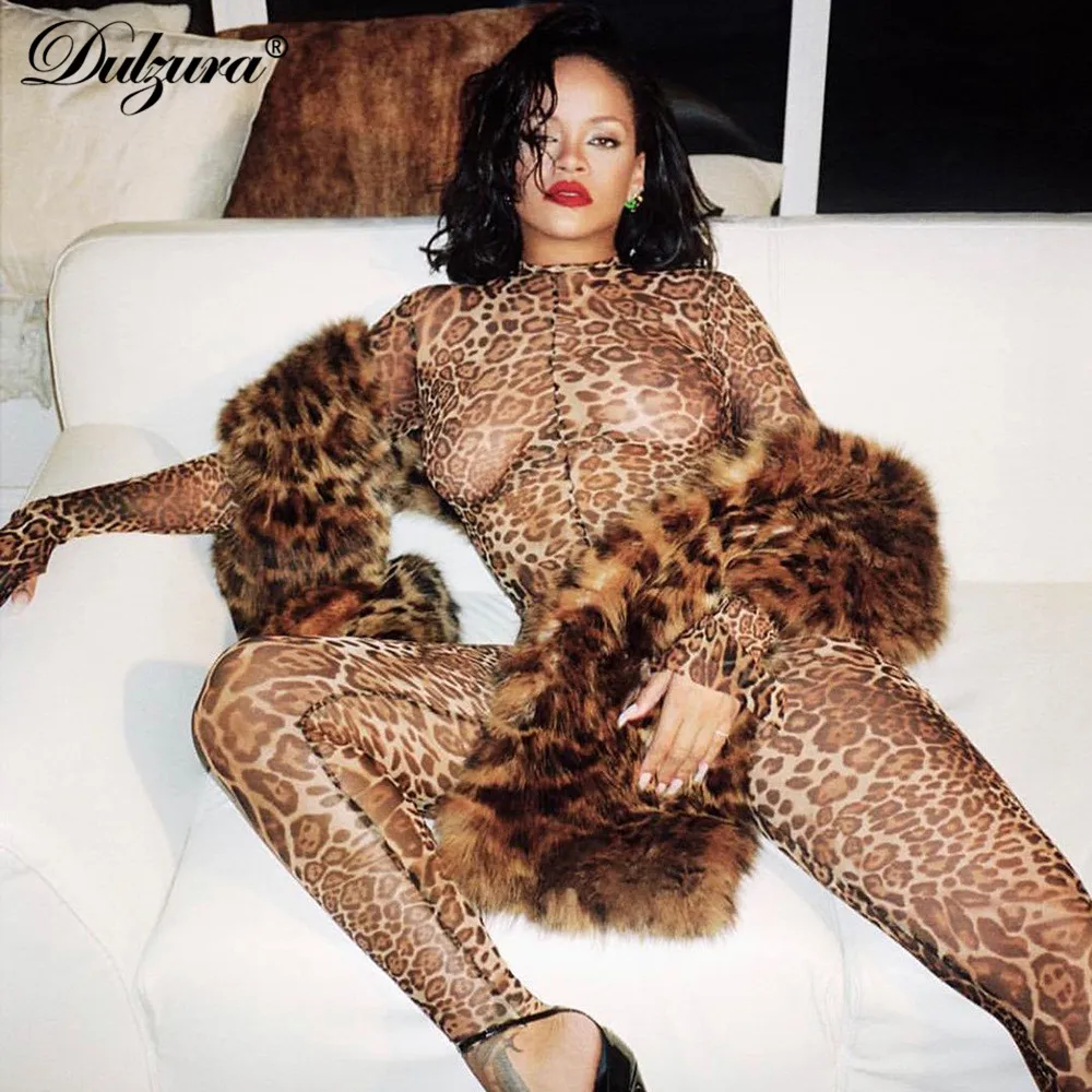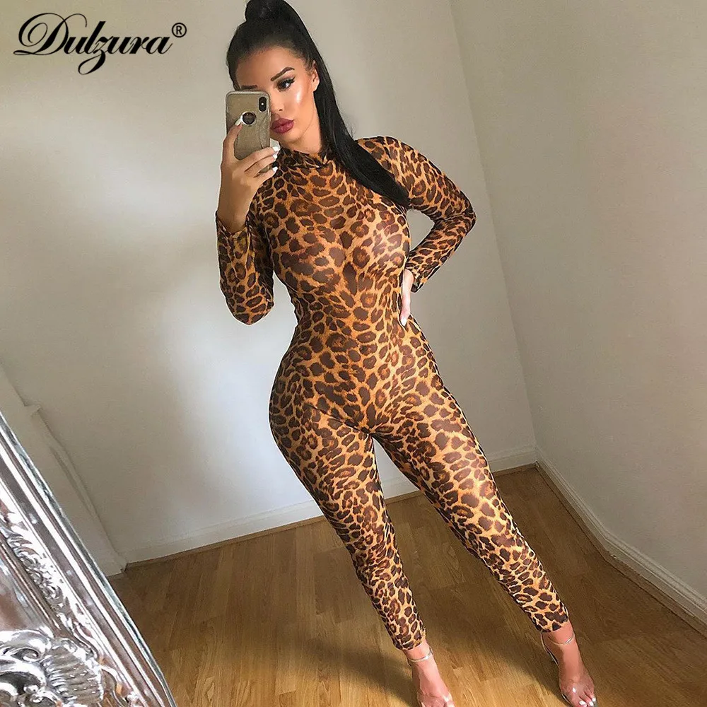 Special Offer Dulzura see through transparent leopard print sexy women 2019 winter mesh long jumpsuit festival body outfits party clothing Discount 58% Today!