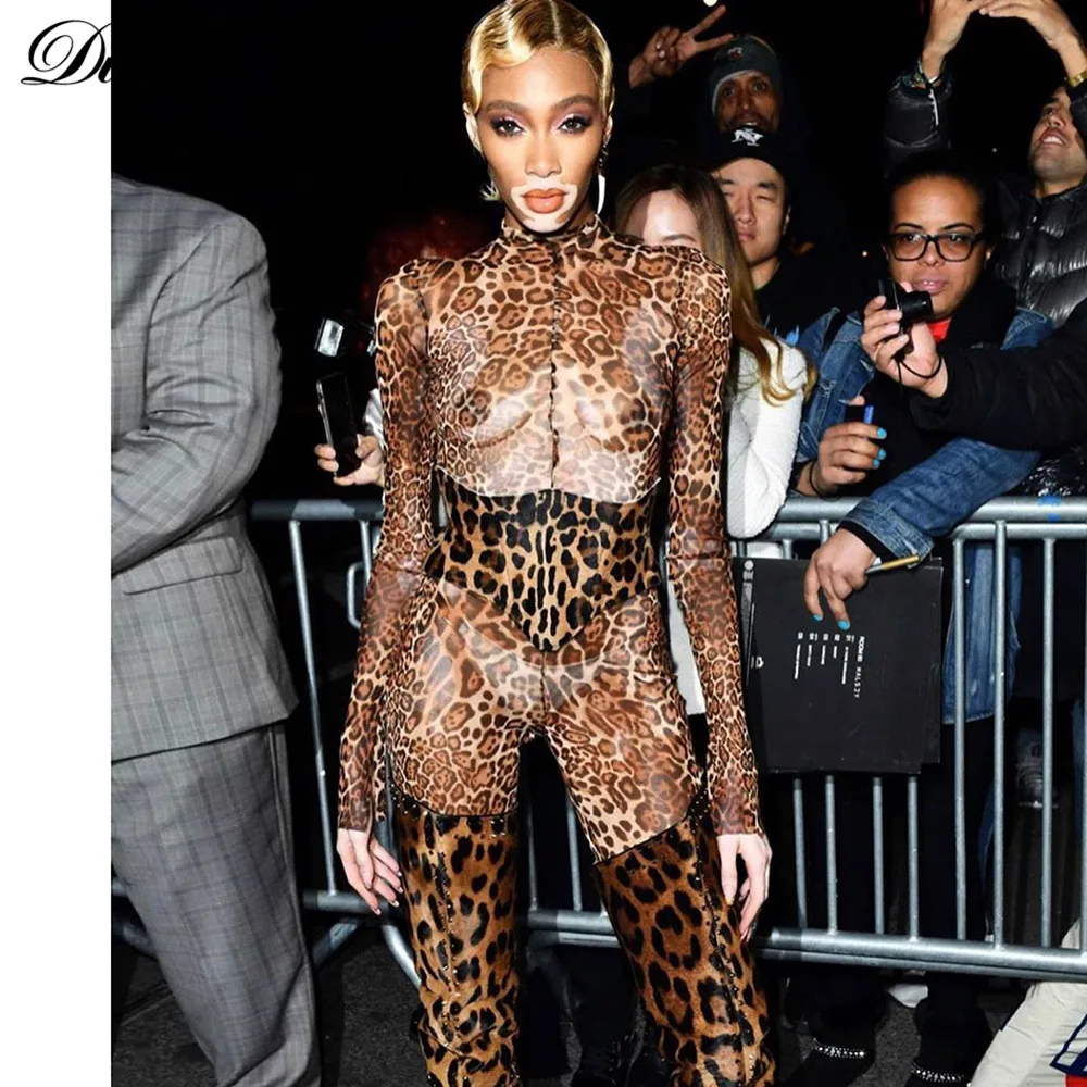 Product Name: Dulzura see through transparent leopard print sexy women 2019 winter mesh long jumpsuit festival body outfits party clothing