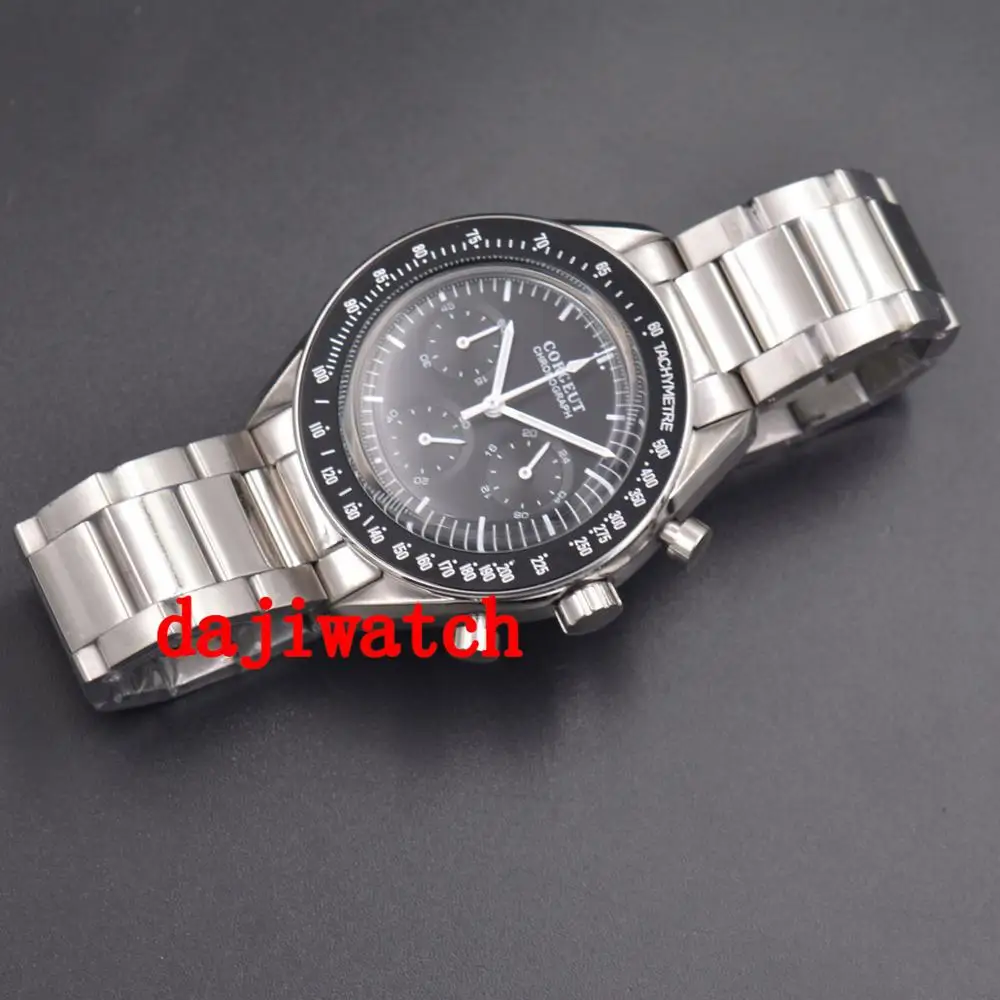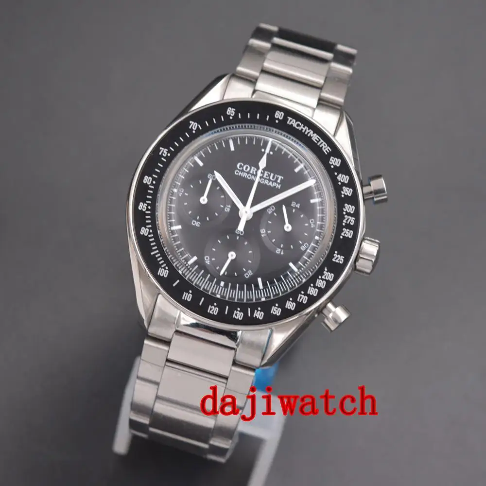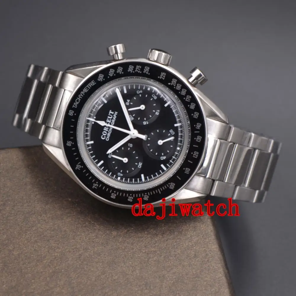 Special Offer 40mm corgeut Multifunction Quartz Mens Watch Full Chronograph black dial steel bracelet men watch Discount 28% Today!