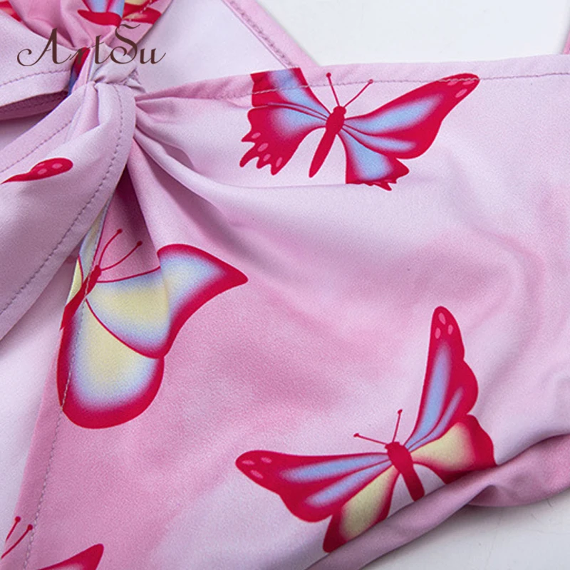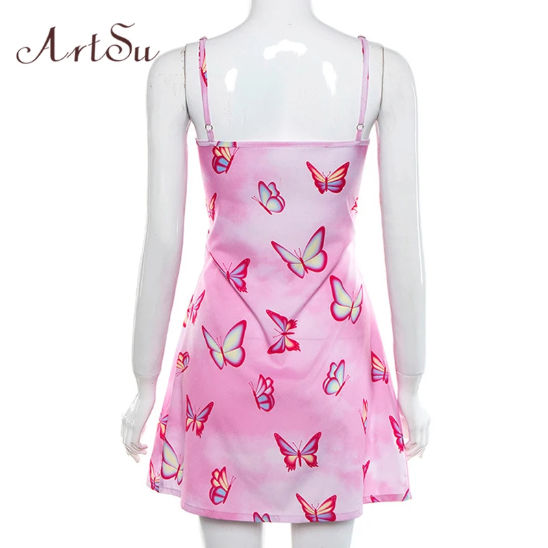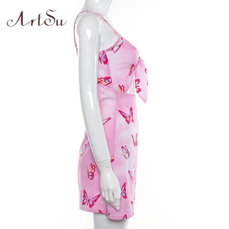 Special Offer ArtSu Pink Butterfly Print Sexy Cute Summer Dress 2019 V neck Bow Spaghetti Strap Backless Mini Sundress Boho ASDR21965 Discount 49% Today!