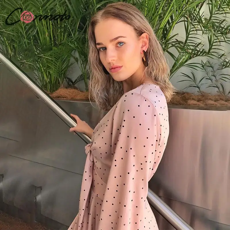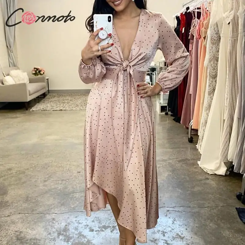 Special Offer Conmoto Women 2019 Autumn Winter Dress Pink Polka Dot Bow Satin Long Dress Elegant Lantern Long Sleeve Maxi Party Dress Vestidos Discount 50% Today!