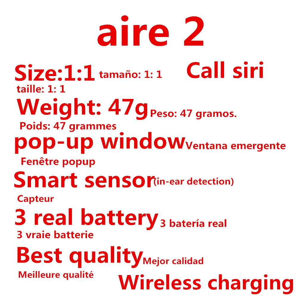 Product Name: New Aire2 Clone Bluetooth Earphones W1 Chip Original Pop Up Windows Earbuds Wireless Headset For iPhone Earphone 2 Generation